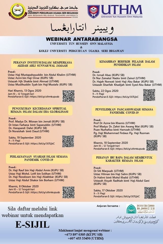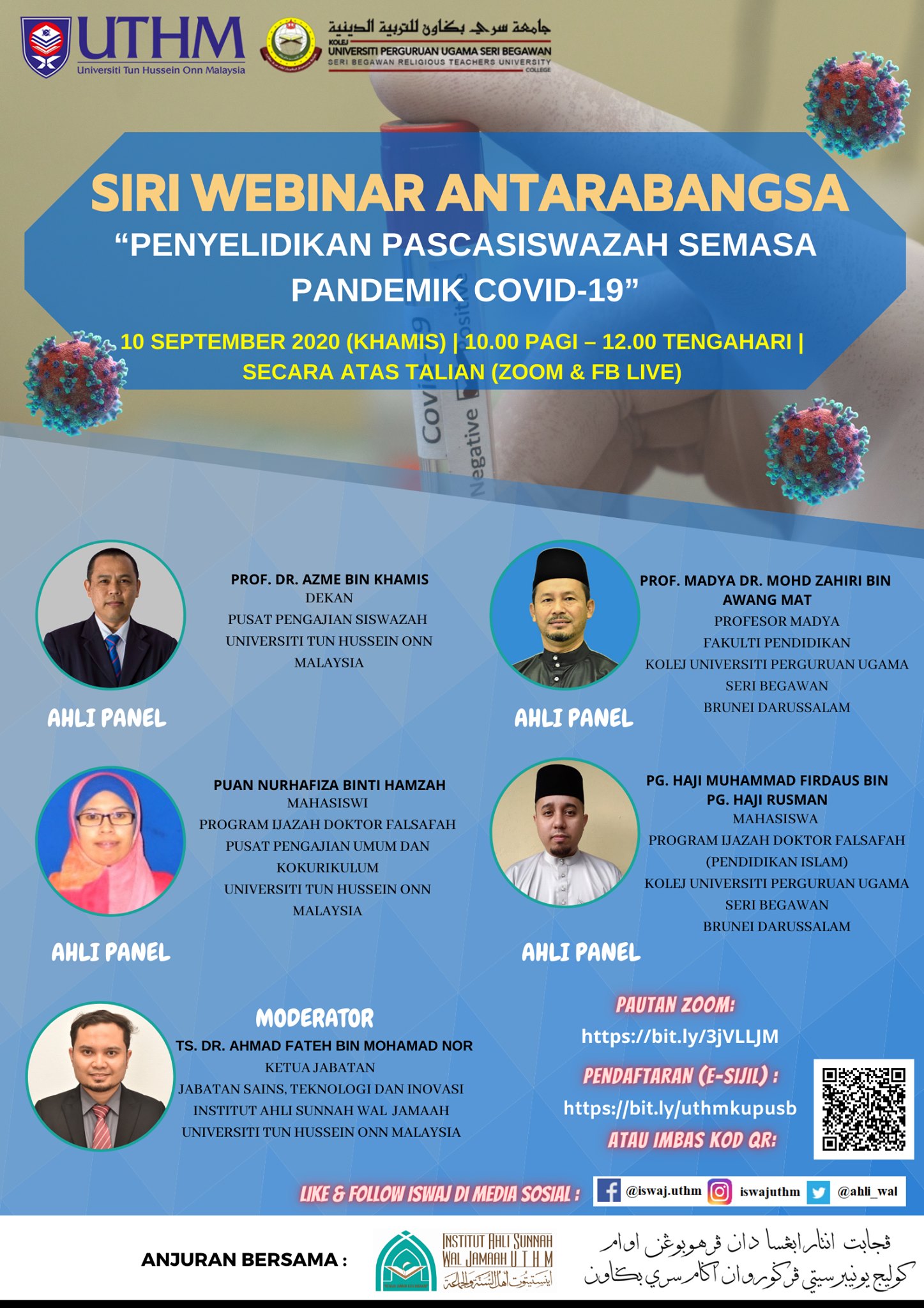 Webinar Antarabangsa Siri 1 "Peranan Institut Dalam Memperkasa Akidah Ahli Sunnah Wal Jamaah" bersama panel pertama Ustaz Hj. Mustapahayuddin Bin Abdul Khalim, Pegawai Syariah Dana Wakaf Pendidikan UTHM merangkap Pengarah iSWAj. Panel kedua, Ustazah Hajah Syakila Ahmad (Pensyarah Kanan Pusat Pengajian Umum dan Kokurikulum, UTHM). Panel ketiga, Ustaz Haji Mohd Azmi Haji Omar (Pengarah Pusat Pengkajian Kefahaman Ahli Sunnah Wal Jamaah, Kolej Universiti Perguruan Ugama Seri Begawan, Brunei Darussalam. Panel terakhir, Syahruddin, M.Sc.Fin (Director, International Center for Awqaf Studies (ICAST) UNIDA Gontor).