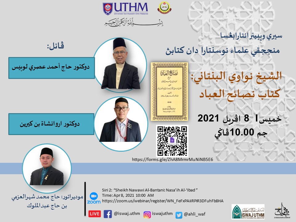 Webinar Antarabangsa UTHM & KUPU SB Siri 2 “Sheikh Nawawi Al-Bantani: Nasa’ih Al-‘Ibad ”. "Menjejaki Ulama' Nusantara dan Kitabnya" bersama panel pertama YM Dr Asri Lubis (KUPU SB). Panel kedua, Dr Arwansyah bin Kirin (UTHM). Seterusnya, dikendalikan oleh moderator YM Muhammad Shahrul Azmi bin Hj Abdul Muluk. Anjuran Institut Ahli Sunnah wal Jamaah Universiti Tun Hussein Onn Malaysia & Pusat Pengkajian Turath dan Jawi, Kolej Universiti Perguruan Ugama Seri Begawan, Brunei Darussalam.