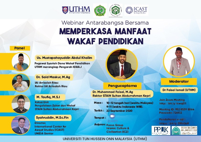 Webinar Antarabangsa bersama "Memperkasa Manfaat Wakaf Pendidikan" bersama panel pertama Ustaz Hj. Mustapahayuddin Bin Abdul Khalim, Pegawai Syariah Dana Wakaf Pendidikan UTHM merangkap Pengarah iSWAj. Panel kedua, Dr. Said Maskur, M.Ag (Rektor IAI Arrissalah, Riau). Panel ketiga, M. Taufiq, M.S.I (Ketua unit pengelolaan zakat dan wakaf STAIN Sultan Abdurrahman Kepri). Panel terakhir, Syahruddin, M.Sc.Fin (Director, International Center for Awqaf Studies (ICAST) UNIDA Gontor).