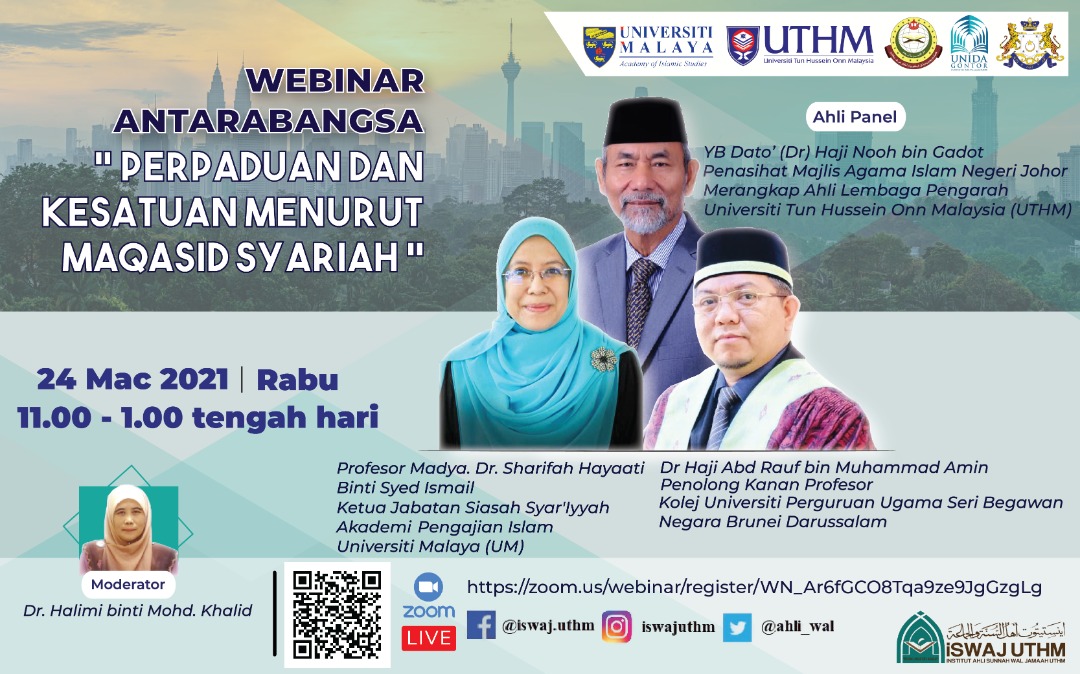 Webinar Antarabangsa "Perpaduan dan Kesatuan Menurut Maqasid Syariah" bersama panel pertama YB Dato' (Dr) Haji Nooh bin Gadot, Penasihat Majlis Agama Islam Negeri Johor Merangkap Ahli Lembaga Pengarah UTHM. Panel kedua, Prof. Madya Dr. Sharifah Hayaati binti Syed Ismail, Ketua Jabatan Siasah Syar'Iyyah, Akademi Pengajian Islam, Universiti Malaya. Panel terakhir, Dr. Haji Rauf bin Muhammad Amin, Penolong Kanan Profesor, KOLEJ UNIVERSITI PERGURUAN UGAMA SERI BEGAWAN, Brunei Darussalam.