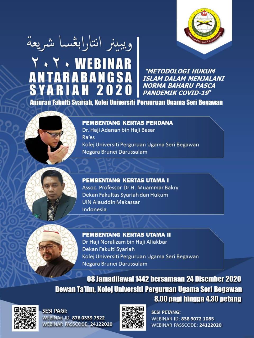 Webinar Antarabangsa Syariah "Metodologi Hukum Islam Menjalani Norma Baharu Pasca Pandemik Covid-19" bersama panel pertama pembentang kertas perdana, Dr. Haji Adanan Bin Haji Basar, Ra'es Kolej Universiti Perguruan Ugama Seri Begawan, Negara Brunei Darussalam. Panel kedua, Assoc. Professor Dr. H. Muammar Bakry, Dekan Fakultas Syariah dan Hukum, UIN Alauddin Makassar, Indonesia. Panel terakhir, Dr. Haji Noralizam Bin Haji Aliakbar, Dekan Fakulti Syariah Kolej Universiti Perguruan Ugama Seri Begawan, Negara Brudei Darussalam. Anjuran Fakulti Syariah, Kolej Universiti Perguruan Ugama Seri Begawan.