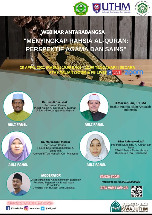 Webinar Antarabangsa "Menyingkap Rahsia Al-Quran: Perspektif Agama dan Sains" bersama panel pertama Dr. Hamdi Bin Ishak, Pensyarah Kanan, Pusat Kajian Al-Quran & Al-Sunnah, Universiti Kebangsaan Malaysia (UKM). Panel kedua, H. Marsapuan, LC, MA, Institut Agama Islam Arrisalah Indonesia. Panel ketiga, Dr. Marlia Binti Morsin, Pensyarah Kanan, Fakulti Kejuruteraan Elektrik & Elektronik, UTHM. Panel terakhir, Dian Rahmawati, MA, Program Studi Ilmu Al-Quran & Tafsir, STAIN Sultan Abdurrahman, Kepulauan Riau, Indonesia. Seterusnya, dikendalikan oleh moderator Ustaz Muhammad Amirulhakim Bin Saparudin, Penolong Pegawai Hal Ehwak Islam, Pusat Islam, UTHM.