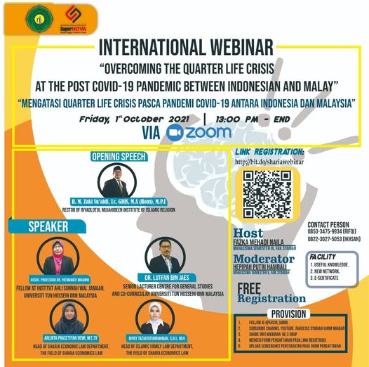 Webinar Antarabangsa "Mengatasi Quarter Life Crisis Pasca Pandemi Covid-19 Antara Indonesia dan Malaysia" bersama panel pertama Dr. Lutfan Bin Jaes, Pensyarah Kanan, Pusat Pengajian Umum dan Kokurikulum, UTHM. Panel kedua, Assoc. Professor Dr. Patmawati Ibrahim, Felo, Institut Ahli Sunnah Wal Jamaah, UTHM. Panel ketiga, Arlinta Prasetiyan Dewi, M.E.Sy, Ketua Jabatan Undang-undang Ekonomi Syariah, Bidang Undang-undang Ekonomi Syariah. Panel terakhir, Rifqy Tazkiyaturrohmah, S.H.I., M.H, Ketua Jabatan Undang-undang Keluarga Islam, Bidang Undang-undang Ekonomi Syariah. Seterusnya, dikendalikan oleh H. M. Zaki Su’aidi, Lc, GDIS, M.A (Hons), M.P.I, Rektor, Institut Agama Islam Riyadlotul Mujahideen.