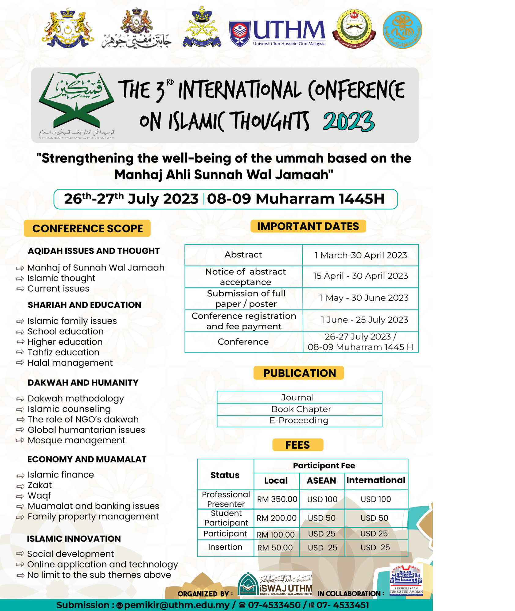 Persidangan Antarabangsa Pemikiran Islam: Kali Ketiga (PEMIKIR 3) 2023 yang telah diadakan pada 26 - 27 Julai 2023 di Perpustakaan Tunku Tun Aminah, Universiti Tun Hussein Onn Malaysia.