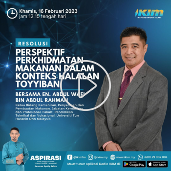 RESOLUSI - Perbincangan tentang "Perspektif Perkhidmat Makanan Dalam Konteks Halalan Toyyiban" bersama tetamu Encik Abdul Wafi Abdul Rahman (Ketua Bidang Kemahiran, Penyediaan dan Pembuatan Makanan, Jabatan Kemahiran dan Profesional, Fakulti Pendidikan Teknikal dan Vokasional, Universiti Tun Hussein Onn Malaysia - UTHM). Rancangan ini dikendalikan oleh penyampai Syafiq Salleh.