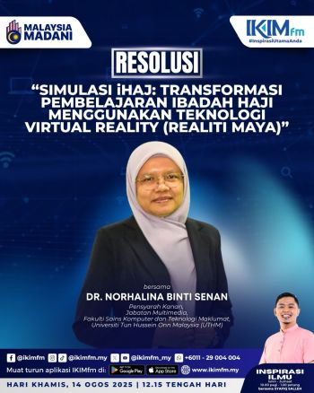 RESOLUSI - "Simulasi iHaji: Transformasi Pembelajaran Ibadah Haji menggunakan Teknologi Virtual Reality (Realiti Maya)" bersama tetamu Dr. Norhalina Binti Senan (Pensyarah Kanan, Jabatan Multimedia, Fakulti Sains Komputer dan Teknologi Maklumat, Universiti Tun Hussein Onn Malaysia - UTHM). Aplikasi Simulasi iHaji ini telah menerima Anugerah Khas iSWAJ dalam International Research and Innovation Symposium Exhibition 2025 RISE 2025). Rancangan ini dikendalikan oleh penyampai Syafiq Salleh.