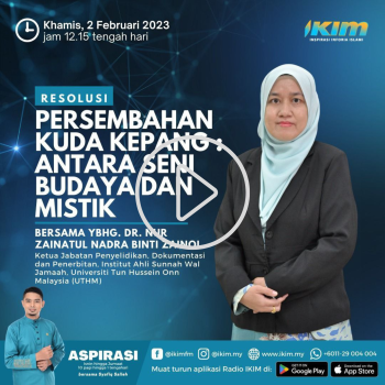 RESOLUSI - Perbincangan tentang "Persembahan Kuda Kepang : Antara Seni Budaya dan Mistik" bersama tetamu YBhg. Dr. Nur Zainatul Nadra Zainol (Ketua Jabatan Penyelidikan, Dokumentasi dan Penerbitan, Institut Ahli Sunnah Wal Jamaah, Universiti Tun Hussein Onn Malaysia - UTHM). Rancangan ini dikendalikan oleh penyampai Syafiq Salleh.