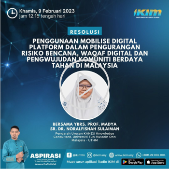 RESOLUSI - Perbincangan tentang "MOBILISE Digital Platform Dalam Pengurangan Risiko Bencana dan Waqaf Digital" bersama tetamu YBrs. Prof. Madya. Sr. Dr. Noralfishah Sulaiman (Pengarah KANZU Research, Universiti Tun Hussein Onn Malaysia - UTHM). Rancangan ini dikendalikan oleh penyampai Syafiq Salleh.