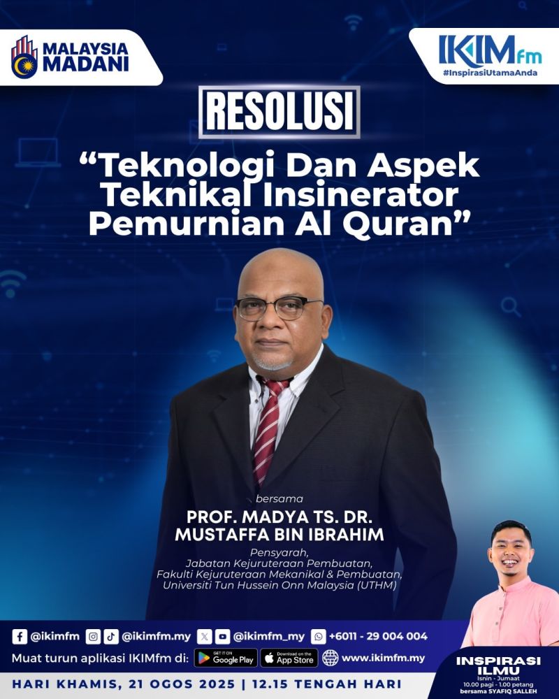 RESOLUSI - "Teknologi Dan Aspek Teknikal Insinerator Pemurnian Al-Quran" bersama tetamu Prof. Madya. Ts. Dr Mustaffa Bin Ibrahim (Penyelidik Utama Fakulti Kejuruteraan Mekanikal dan Pembuatan, Engineering Design Research Group (EDRG), Universiti Tun Hussein Onn Malaysia - UTHM). Rancangan ini dikendalikan oleh penyampai Syafiq Salleh.